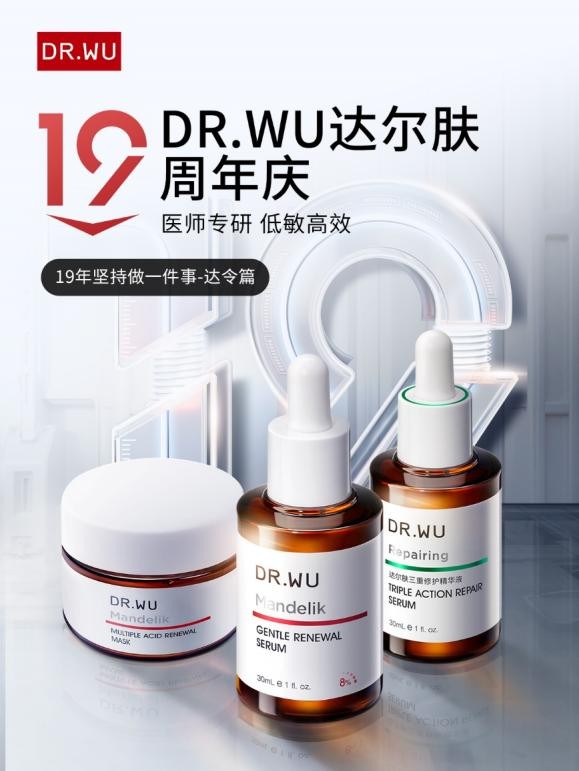 19周年之际,针对不同痘肌问题,DR.WU达尔肤特别推出三种周年庆限定礼盒:DR.WU达尔肤抗痘修红2件套(三重修复精华、杏仁酸精华液8%),用于去闭口粉刺及痘后修红;DR.WU达尔肤抗痘去闭口2件套(杏仁酸精华液8%、复合酸焕颜调理面膜),帮助痘肌人群使用复合酸焕肤,抗痘去闭口;DR.WU达尔肤抗痘淡印3件套(三重修复精华、杏仁酸精华液8%及复合酸焕颜调理面膜),兼顾日常修护、日常焕肤和周期焕肤需求。